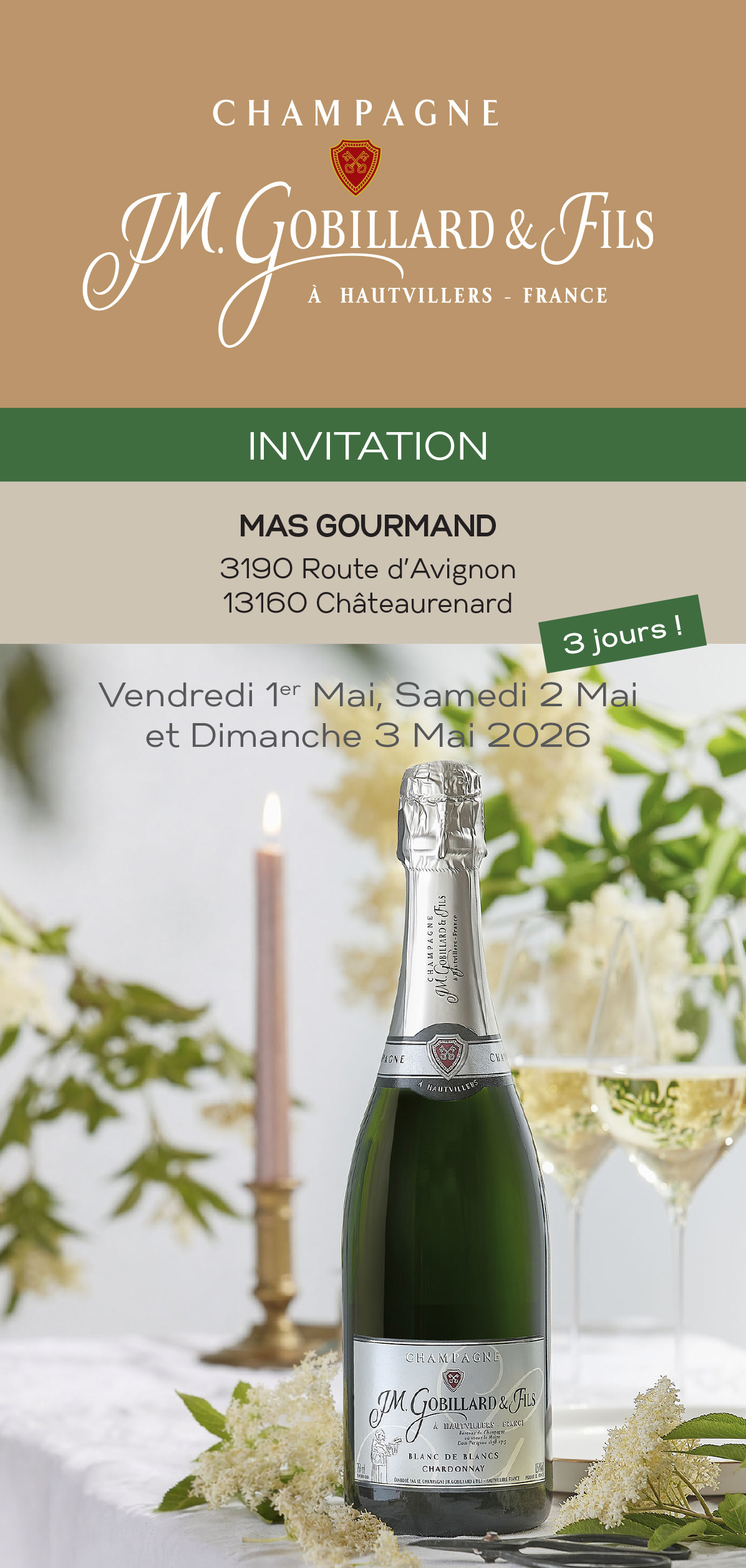 Retrouvez le champagne JM Gobillard au Mas Gourmand Pour les portes ouvertes, venez déguster toutes les cuvées de la maison Gobillard aux côtés de la famille. Repartez avec vos cuvées préférées à prix promotionnel pour cette occasion.