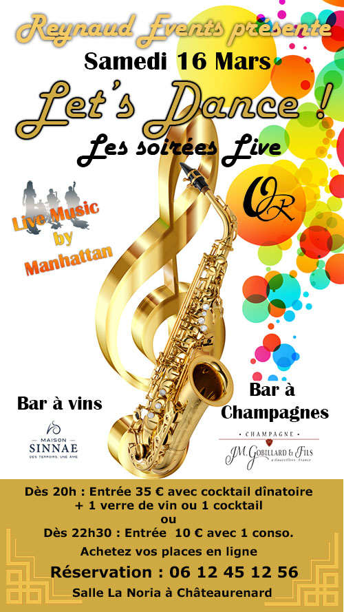 Les soirées « Let’s dance » s’organisent dès 20h autour d’un cocktail dînatoire réalisé par le chef Eric Jourdan, des produits d’exception avec le champagne J.M Gobillard, des vins de la maison Sinnae. L’art culinaire se met au service de la fête, de l’amitié et du partage.